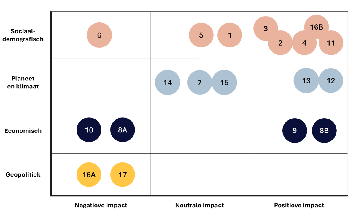 De 17 doelen zijn door de VN weer onderverdeeld in drie categorieën: Sociaal-demografisch, Planeet en klimaat, en Economisch. Wij hebben daar in dit rapport de categorie Geopolitiek aan toegevoegd. Als we de impact van kunstmatige intelligentie in deze categorieën plaatsen, ontstaat het volgende beeld: